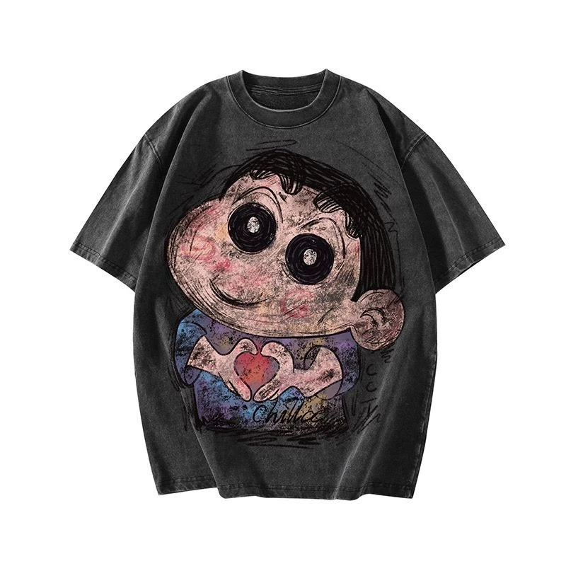 Retro Hand-drawn Shin-chan Short-Sleeved Tee – Oversized Washed Cotton T-Shirt