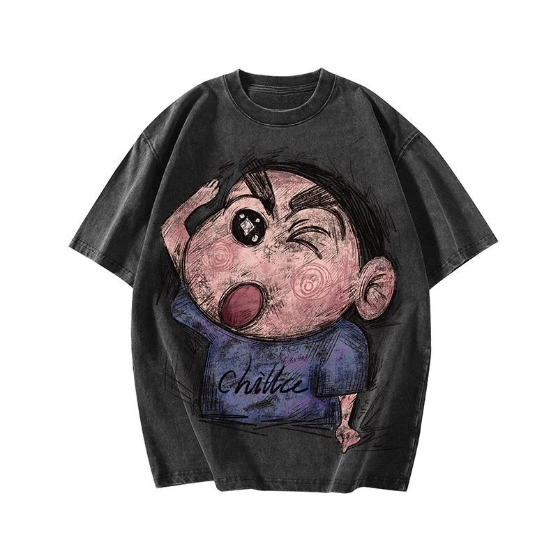 Featuring a charming hand-drawn design of Shin-chan, this casual top adds a fun touch to any outfit. The aged look gives it a trendy vintage vibe, making it perfect for everyday wear or lounging at home.