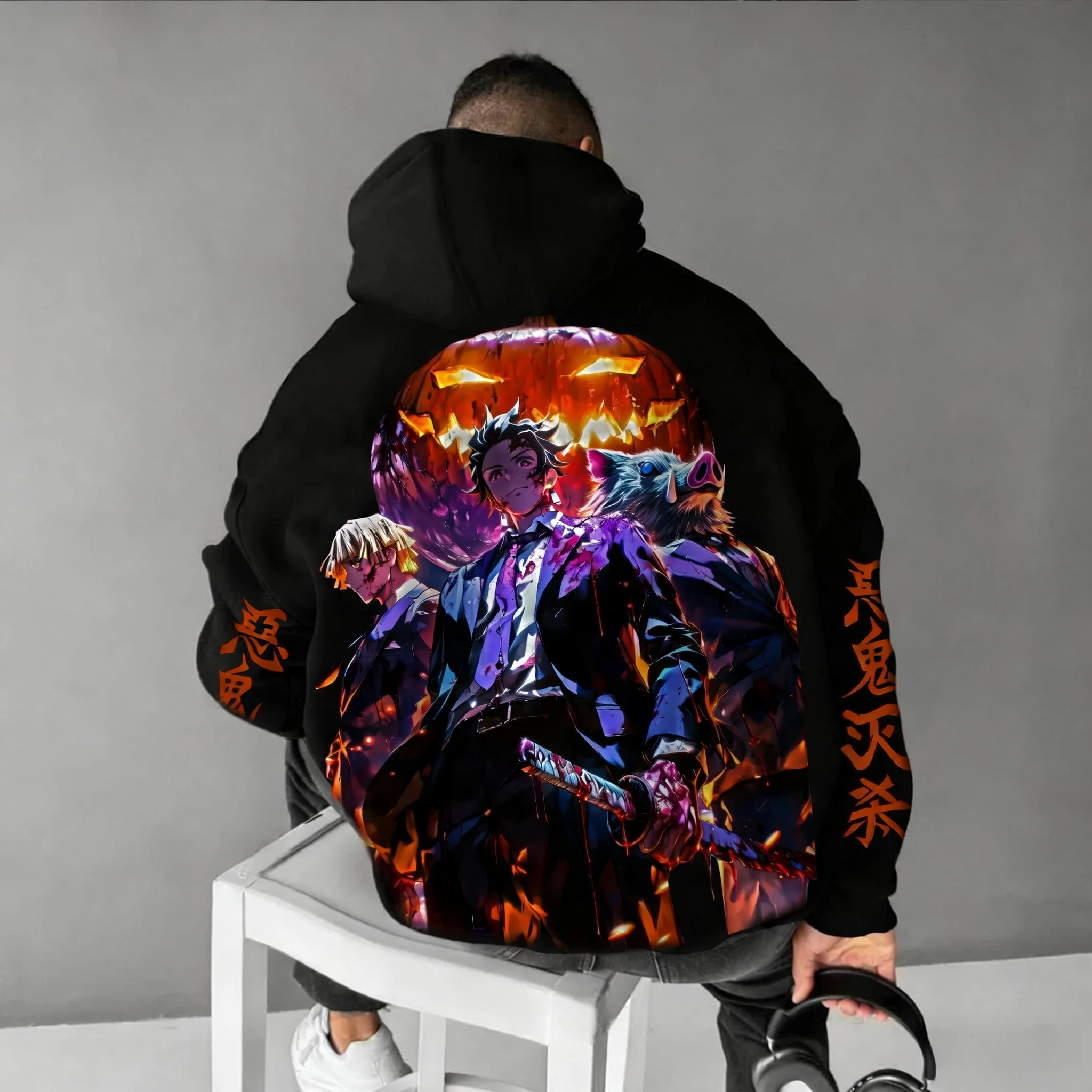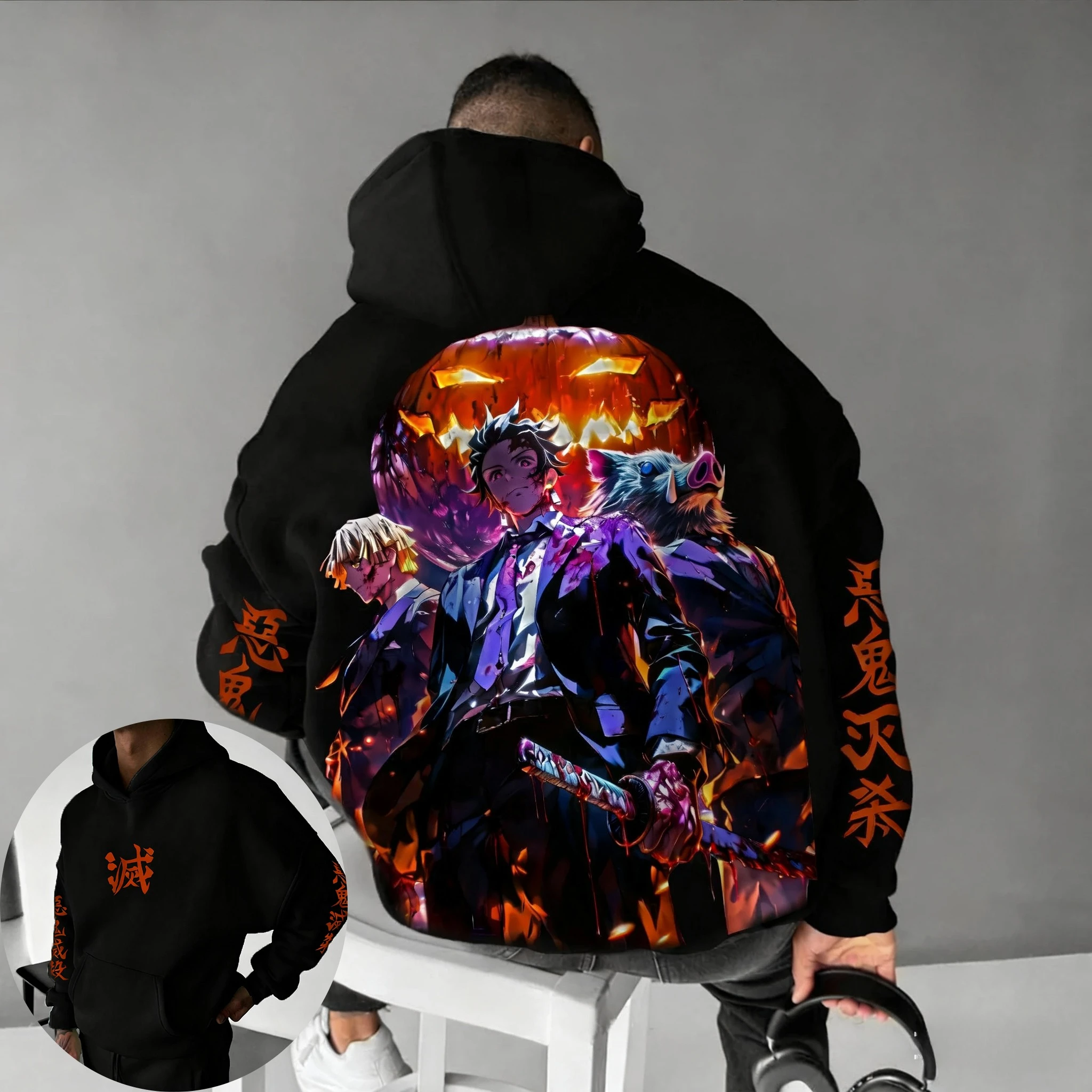 Demon Slayer Halloween Co Branded Hoodie Autumn/Winter Men's New Hashibira Inosuke Anime Printed Casual Loose Parent Child Top